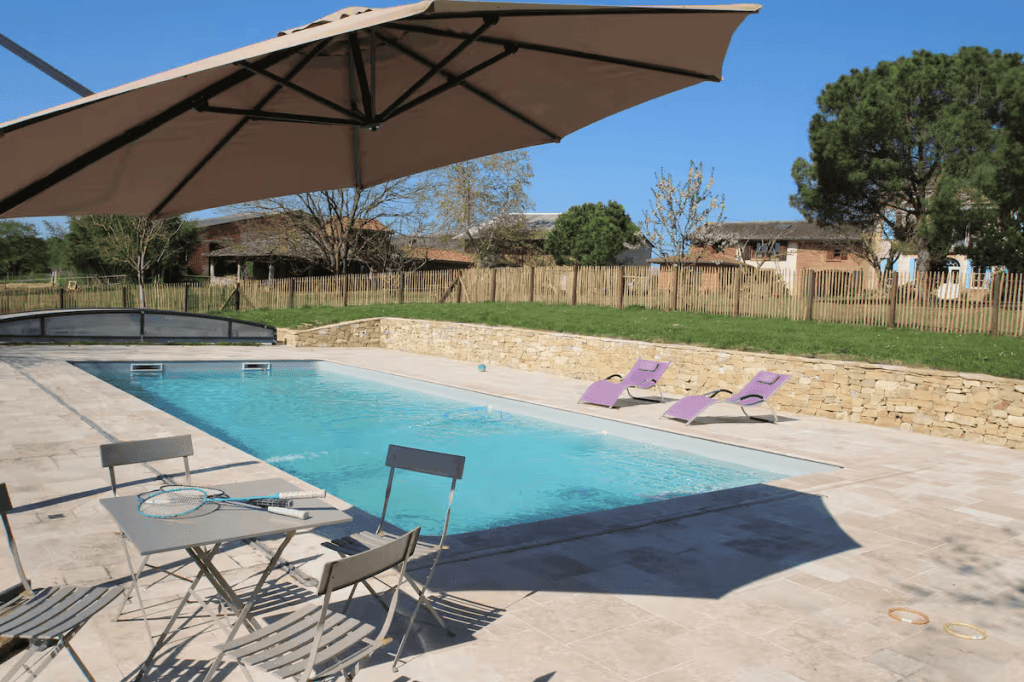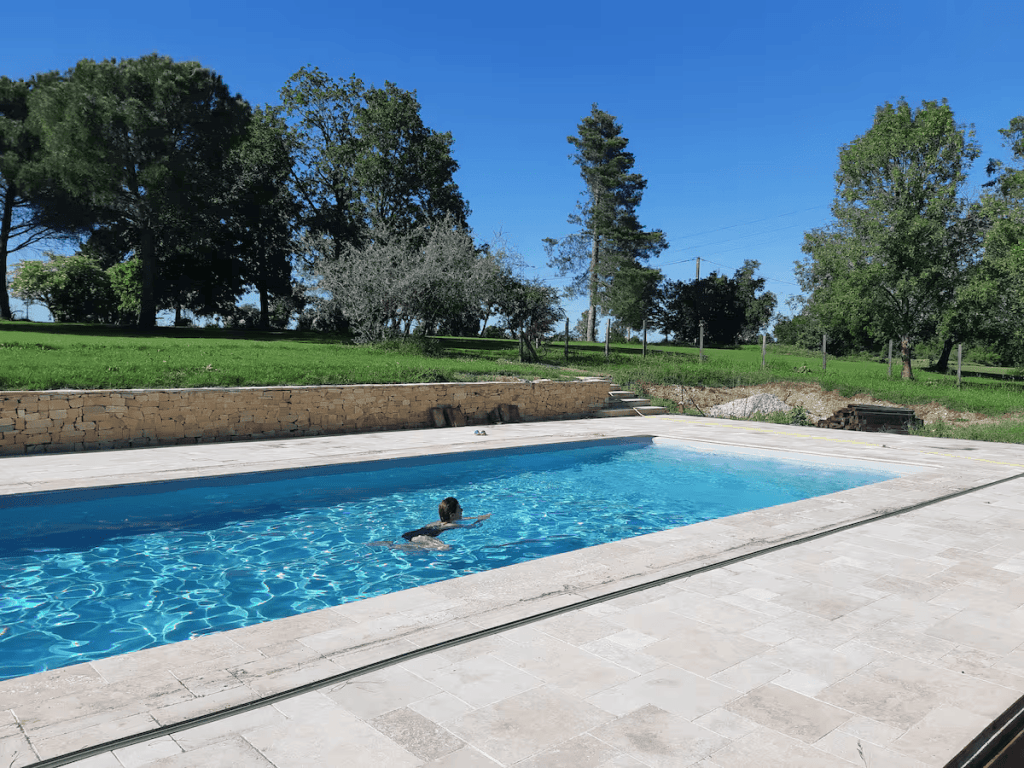 La piscine est partagée avec un autre gîte sur le même parc, mais chacun dispose de son espace pour profiter en toute tranquillité.